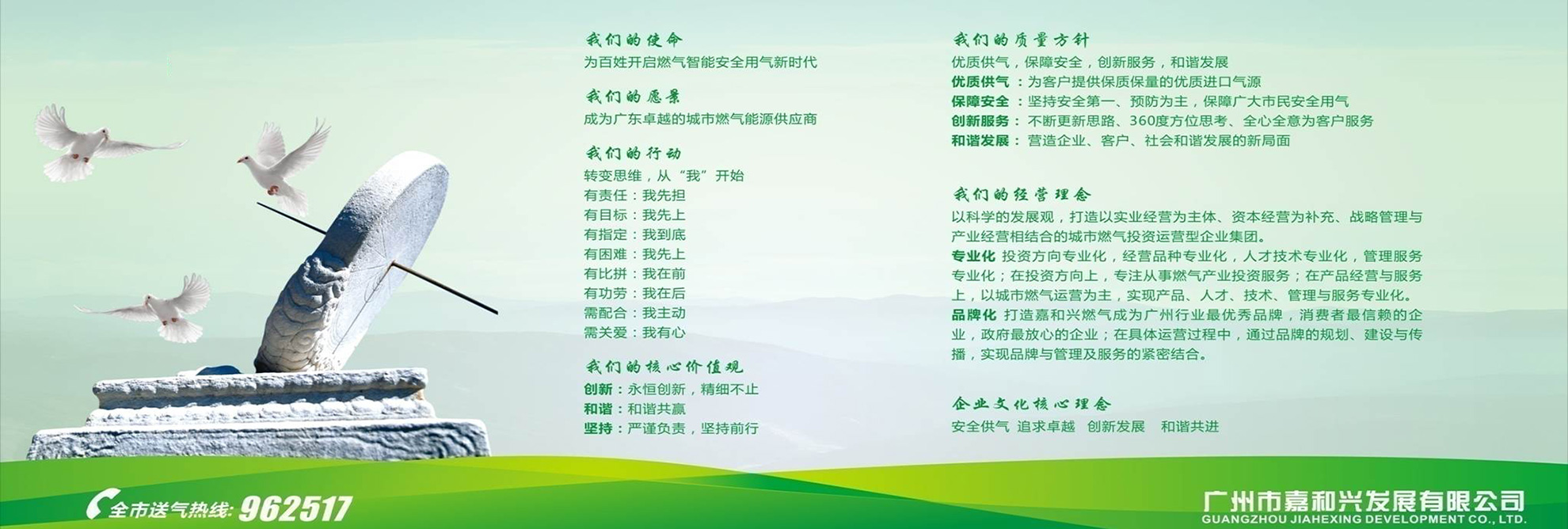 ——廣州市嘉和興發(fā)展有限公司于2001年3月1日注冊成立,主要從事瓶裝液化石油氣(LPG)批發(fā)貿(mào)易,民用、工業(yè)用液化石油氣,工業(yè)用氣體,汽車加氣站及危險品物流運輸?shù)?,總部設(shè)在廣州。目前公司經(jīng)營三個液化氣充裝站、一個汽車加氣站:白云區(qū)神山達(dá)嶺液化石油氣站、白云區(qū)加禾氣站和佛山市南海區(qū)冠順氣站,黃埔區(qū)塘口汽車加氣站,總庫容接近800立方米。